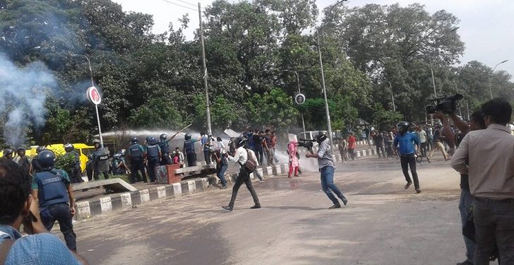 এসময় পুলিশ শিক্ষার্থীদের লক্ষ্য করে কাঁদানে গ্যাসের শেল ছোড়ে। জলকামান দিয়ে পানি ছোড়ে। পরে লাঠিপেটা শুরু করে।