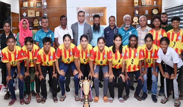 জেএফএ কাপ অনূর্ধ্ব-১৪ নারী ফুটবলে খুলনা জেলা দল চ্যাম্পিয়ন হওয়ার গৌরব অর্জন করেছে। এই আনন্দের মুহূর্তে শনিবার দুপুর ১২টায় খুলনা জেলা প্রশাসকের কার্যালয়ে তাদের সঙ্গে একটি সৌজন্য সাক্ষাৎ অনুষ্টিত হয়। এতে উপস্থিত ছিলেন জেলা ফুটবল এসোসিয়েশনের উপদেষ্টা ও জেলা প্রশাসক মোঃ সাইফুল ইসলাম। খেলোয়াড় ও কর্মকর্তাদের সঙ্গে ট্রফিসহ উপস্থিত হন তিনি। সাক্ষাৎকালে জেলা প্রশাসক তাদের ধন্যবাদ জানিয়ে বলেন, খুলনার জন্য এই সাফল্য গর্বের। খেলাধুলা মানুষের মন ও শরীরের জন্য খুবই উপকারী। এই সফলতা ধরে রাখতে সবাইকে কঠোর পরিশ্রম চালিয়ে যেতে হবে। অনুষ্ঠানে উপস্থিত ছিলেন জেলা ক্রীড়া অফিসার মোঃ আলিমুজ্জামান, খুলনা জেলা ফুটবল এসোসিয়েশনের সাধারণ সম্পাদক মোঃ ইউসুফ আলী, কোষাধ্যক্ষ মোঃ নুরুল ইসলাম খান কালু, কার্যনির্বাহী সদস্য এম এ জলিল, মনিরুজ্জামান মহসীন ও এজাজ আহমেদ। উল্লেখ্য, ১৯ আগস্ট বিকেলে মাগুরা জেলা স্টেডিয়ামে অনুষ্ঠিত ফাইনালে খুলনা জেলা মহিলা ফুটবল দল মাগুরা জেলা দলকে ৩-১ গোলে হারিয়ে চ্যাম্পিয়ন হওয়ার গর্ব অর্জন করে। খুলনা দলের খেলোয়াড়রা মধ্যে রয়েছেন: লাকি, ইসরাম খান, বিপাশা আক্তার তিশা, জৈতি রায় মুন্নী, আলো খাতুন, রিমা সরকার, দিয়া মন্ডল, তানিশা আক্তার তন্নী, ঐশ্বর্য্য বাছাড়, খাদিজা খাতুন, সুমী খাতুন, সানজিদা সুলতানা ও দৃষ্টি মন্ডল।