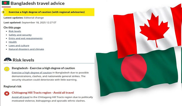 কানাডা বাংলাদেশের ভ্রমণে তাদের নাগরিকদের জন্য সতর্কতা জারি করেছে। দেশটির সরকারীয় ওয়েবসাইটের ‘ভ্রমণ’ বিভাগে শুক্রবার এক বিশেষ বিজ্ঞপ্তি প্রকাশ করে এই সতর্কতা জানান। এতে বলা হয়, বাংলাদেশে বর্তমানে যে পরিস্থিতি রয়েছে, সেটি খুবই সংবেদনশীল বা অস্থির। এজন্য বাংলাদেশের পুরো অঞ্চলসমূহে উচ্চ সতর্কতা অবলম্বন করার আহ্বান জানানো হয়। বিশেষ করে পার্বত্য তিন জেলায় ভ্রমণে নিষেধাজ্ঞা জারি করেছে কানাডা। অর্থাৎ, এই অঞ্চলে প্রবেশ বা ভ্রমণ এড়ানো উচিত। এই সতর্কতামূলক চিহ্নগুলো হলো হলুদ, যা নির্দেশ করে সেখানে নিরাপত্তার জন্য উচ্চ পর্যায়ে সাবধানতা অবলম্বন করতে হবে; এবং লাল চিহ্ন, যা নির্দেশ করে পার্বত্য অঞ্চলে ভ্রমণে সম্পূর্ণ এড়ানো জরুরি। কানাডা সরকারের তরফে সতর্কবার্তায় বলা হয়েছে, বাংলাদেশে সম্ভাব্য বিক্ষোভ, সংঘর্ষ এবং দেশব্যাপী হরতাল-অবরোধের কারণে পরিস্থিতি দ্রুত পরিবর্তিত হতে পারে। নাগরিকদের বলা হচ্ছে, হয়তো কোনো আগাম সংঙ্কেত ছাড়াই পরিস্থিতির অবনতি ঘটতে পারে, তাই সদাশয্য থাকতে হবে। বিশেষ করে পার্বত্য চট্টগ্রামে দেশজুড়ে রাজনৈতিক অস্থিতিশীলতা, সহিংসতা, অপহরণ এবং ক্ষুদ্র নৃগোষ্ঠীর মধ্যে ছোটাছুটি সহ নানা অরাজকতা রোধে সেইসব এলাকায় ভ্রমণ এড়িয়ে যাওয়ার পরামর্শ দেওয়া হয়েছে।