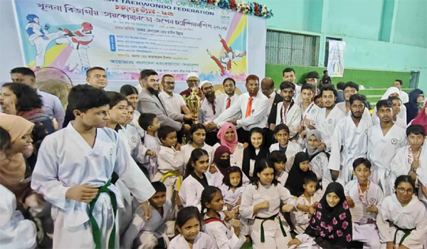 খুলনা বিভাগের বৃহৎ তায়কোয়ানডো প্রতিযোগিতা, ‘খুলনা বিভাগীয় তায়কোয়ানডো ওপেন চ্যাম্পিয়নশিপ ২০২৫’, সফলভাবে সম্পন্ন হয়েছে। গতকাল রবিবার যশোর জেলায় অবস্থিত ক্রীড়া জিমনেশিয়ামে this আসর অনুষ্ঠিত হয়, যেখানে বিভাগীয় পর্যায়ের প্রতিযোগীদের পদচারণায় উৎসবের আবহ সৃষ্টি হয়েছিল। বাংলাদেশ তায়কোয়ানডো ফেডারেশনের উদ্যোগে এবং বিভাগীয় ক্রীড়া সংস্থা খুলনা ও যশোর জেলা ক্রীড়া সংস্থার যৌথ তত্ত্বাবধানে এই প্রতিযোগিতা আয়োজন করা হয়। এতে অংশগ্রহণ করে আটটি জেলার মোট ১৩০ জন ক্রীড়াবিদ, যার মধ্যে ৮৫ জন পুরুষ ও ৪৫ জন নারী। শিশু, যুবক ও যুবতীদের মধ্যে এই প্রতিযোগিতা নতুন চাঞ্চল্য সৃষ্টি করে। যশোর জেলা ক্রীড়া সংস্থা এই আসরে মোট ২৪ স্বর্ণ, ১৯ রৌপ্য ও ১৩ তাম্র পদক লাভ করে, যা তাদের চূড়ান্ত বিজয়াধিকার নিশ্চিত করে। দ্বিতীয় স্থান অধিকার করে কুষ্টিয়া জেলা ক্রীড়া সংস্থা, যাদের কোলাকুলা স্বর্ণ সহ মোট ১৪ স্বর্ণ, ৮ রৌপ্য, ও ৭ তাম্র পদক অর্জন করে। নড়াইল জেলা সংস্থা যথাক্রমে ৪ স্বর্ণ, ৫ রৌপ্য ও ৩ তাম্র পদক নিয়ে দ্বিতীয় রানার্স আপ হয়। অনুষ্ঠানের প্রধান অতিথি ছিলেন বাংলাদেশ তায়কোয়ানডো ফেডারেশনের সভাপতি মেজর জেনারেল মোঃ হাবিব উল্লাহ, যিনি দেশের খ্যাতনামা ক্রীড়া ব্যক্তিত্ব। বিশেষ অতিথির মধ্যে ছিলেন যশোর তায়কোয়ানডো অ্যাসোসিয়েশনের সভাপতি এস কে মোঃ ওয়ালিউর রহমান ও যশোর জেলা প্রশাসক মোঃ আজাহারুল ইসলাম। উপস্থিত ছিলেন জেলার ক্রীড়া কর্মকর্তা, নেতৃবৃন্দ ও ক্রীড়াপ্রেমীরা, যারা উদ্বোধন ও পুরস্কার বিতরণ করেন। প্রতিযোগিতা শেষে বিজয়ীদের হাতে পুরস্কার ও সনদ তুলে দেন অতিথিরা, যা স্মরণীয় হয়ে থাকবে এই আয়োজন। আসরের রেফারী ও পরিচালকদের প্রশংসায় ভরে উঠেছিল সার্বিক কার্যক্রম।