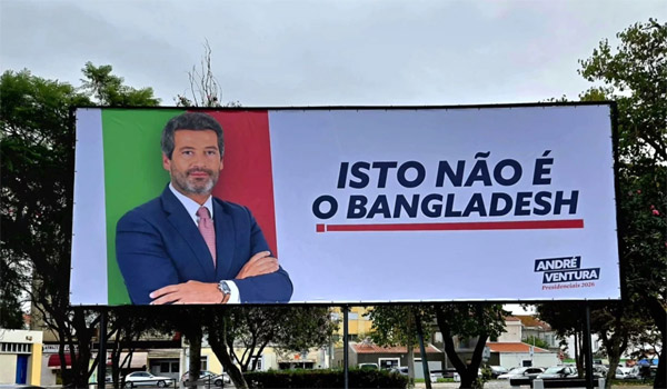 পর্তুগালের কট্টর ডানপন্থি নেতা আন্দ্রে ভেনচুরা এবং তার দল শেগার নতুন নির্বাচনি প্রচার এখন সমালোচনার কেন্দ্রবিন্দুতে পরিণত হয়েছে। মন্তিজো শহরের একটি বাসস্টপে ঝুলানো একটি বিলবোর্ডে বড় ছোট অক্ষরে লেখা ছিল, ‘Isto não é Bangladesh’ অর্থাৎ ‘এটি বাংলাদেশ নয়’। এই বাক্যটি স্থানীয় বাংলাদেশি কমিউনিটির মধ্যে ক্ষোভ সৃষ্টি করেছে। আরও একটি পোস্টারে লেখা ছিল, ‘জিপসিদের আইন মানতে হবে’, যা জেনোফোবিয়া এবং বর্ণবাদী রঙে রঙিন বিতর্কের জন্ম দিয়েছে। এই পোস্টার গুলোকে কেন্দ্র করে ব্যাপক বিতর্ক ছড়িয়েছে। ভেনচুরা নিজে এই পোস্টারগুলোর ছবি তার ইনস্টাগ্রামে শেয়ার করে লিখেছেন, ‘ওরা এরই মধ্যে রাস্তায় নেমে পড়েছে। ১৮ জানুয়ারি আমরা এই দেশের ভাবমূর্তি পরিবর্তন করতে চলেছি। কোনো ভয় নেই!’। এই পোস্টার গুলোর বিতর্কের মাঝে মনোযোগ আকর্ষণ করছে তার রাজনৈতিক উদ্দেশ্য। তবে এই বিতর্কের ব্যাপারে মন্তিজো শহরের মেয়র কার্লোস আলবিনো বলেছেন, ‘যখন বলা হয় আইন মানতে হবে, তখন সবাইকেই মানতেই হবে। এটি কোনো বিশেষ সম্প্রদায় বা দলের জন্য নয়। অভিবাসী হোক বা কোনও রাজনৈতিক দলের সদস্য—সবাই আইন মানতে বাধ্য। আন্ড্রে ভেনচুরার মতো ব্যক্তিরাও আইন মানার বাইরে নয়। জেনোফোবিয়া ও বর্ণবাদ অপরাধ, আর তা আমরা মেনে নিচ্ছি না।’ মেয়র আরও উল্লেখ করেছেন, ‘এটি আইন লঙ্ঘনের শামিল, তাই নগর পরিষদ সরাসরি অভিযোগ দায়ের করবে না। তবে বিষয়টি সংশ্লিষ্ট সংস্থাগুলোর মাধ্যমে তদন্ত করা হবে।’ অন্যদিকে, বাংলাদেশি সাংবাদিক ফারিদ পাটোয়ারি বলছেন, ‘অনলাইনে এই ধরনের বার্তা দেখা যায়, কিন্তু রাস্তায় পোস্টার থাকলে তার প্রভাব অনেক বেশি। এটি সহিংসতার আশঙ্কাও বাড়ায়। পর্তুগাল সাধারণত শান্তিপূর্ণ ও আতিথেয় দেশ হিসেবে পরিচিত, তবে এই ধরনের বার্তা প্রকাশ পেলে আমাদের উচিত দ্রুত প্রতিরোধ গড়ে তোলা।’ বাংলাদেশের দূতাবাস সোশ্যাল মিডিয়ায় এক বিবৃতিতে প্রবাসীদের শান্ত থাকার আহ্বান জানিয়েছে এবং বিষয়টি দ্রুত সমাধানের জন্য সংশ্লিষ্ট কর্তৃপক্ষের সঙ্গে যোগাযোগ করছে। উল্লেখ্য, পর্তুগালে ২০২৬ সালের জানুয়ারিতে প্রেসিডেন্ট নির্বাচন অনুষ্ঠিত হবে। এই নির্বাচনে সম্ভাব্য প্রার্থীদের তালিকায় রয়েছেন বর্তমান প্রেসিডেন্ট মার্সেলো রেবেলো দে সুসা, লুইস মার্কেস মেন্ডেস, আন্তোনিও হোসে সেগুরো, আন্দ্রে ভেনচুরা, হেনরিক গোভেইয়া, জোয়াও কোট্রিম দে ফিগেইরেডো, আন্তোনিও ফিলিপ, ক্যাটারিনা মার্টিনস ও হোর্ঝে পিন্টোসহ আরও বেশ কয়েকজন।
