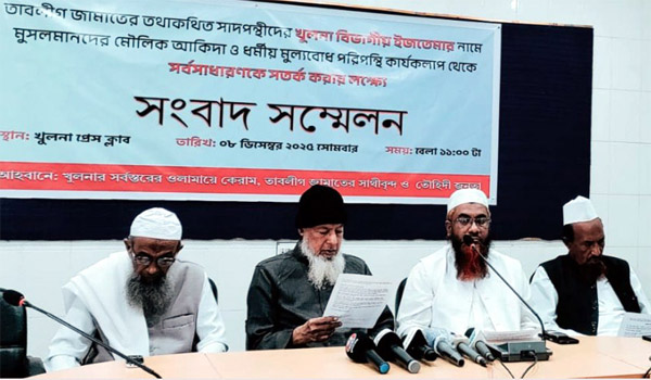 তাবলীগ জামাতের সাদপন্থীদের দ্বারা মুসলমানদের মৌলিক আকিদা ও ধর্মীয় মূল্যবোধের পরিপন্থী অপপ্রচার ব্যাপকভাবে ছড়িয়ে পড়ার জন্য সতর্কবার্তা দিয়েছেন হেফাজতে ইসলাম, জেলা ইমাম পরিষদসহ দেশের বিভিন্ন স্তরের আলেম-ওলামারা। গত মঙ্গলবার দুপুরে খুলনা প্রেসক্লাবে এক সংবাদ সম্মেলনে নেতৃবৃন্দ এ বিষয়টি তুলে ধরেন ও সাধারণ মুসলমানদের সচেতন হওয়ার আহ্বান জানান। সংবাদ সম্মেলনে লিখিত বক্তব্য পড়েছিলেন বাংলাদেশ হেফাজতে ইসলাম খুলনা জেলা শাখার সাধারণ সম্পাদক মুফতি আবদুলাহ্ ইয়াহইয়া। সভাপতি হিসেবে ছিলেন জেলা ইমাম পরিষদের সভাপতি মাওলানা মোহাম্মদ সালেহ, উপস্থিত ছিলেন বিশিষ্ট মাওলানা মুশতাক আহমদ, গোলাম কিবরিয়া, নাছির উদ্দিন কাসেমী ও অন্যান্য উচ্চপদস্থ আলেম-ওলামারা। বক্তব্যে বলা হয়, প্রায় শত বছর ধরে তাবলীগের দাওয়াতি কার্যক্রম বিশ্বব্যাপী নির্বিঘ্নে পরিচালিত হচ্ছে ওয়াজারা আলেম-ওলামাদের পর্যবেক্ষণে। এর মূল উদ্দেশ্য হলো, কুরআন ও হাদিসের আলোকে মুসলমানদের iman, আমল ও আখলাক সংশোধন করা এবং ইসলামের দাওয়াত পুরো বিশ্বে পৌঁছানোর। কিন্তু বর্তমানে এক ভ্রান্ত গোষ্ঠী, যাদের সাদপন্থী বলে আখ্যায়িত করা হয়, দাওয়াতের এই বরকতময় কার্যক্রমের মধ্যেই নিজেদের স্বার্থের জন্য বিভ্রান্তিমূলক প্রচারণা চালাচ্ছে। তারা পবিত্র কুরআন ও সুন্নাহর মনগড়া ব্যাখ্যা, নবী-রাসুল ও সাহাবাদের শানে অপ্রমাণিত মন্তব্য করে ইসলামের মূলনীতি লঙ্ঘনের অপচেষ্টা চালাচ্ছে, যা উম্মতের মধ্যে বিভাজন, বিশৃঙ্খলা এবং ফিতনা সৃষ্টি করছে। বাংলাদেশের পাশাপাশি পৃথিবীর বিভিন্ন দেশে বিশিষ্ট আলেম-ওলামারা এ ভ্রান্ত দলকে গোমরাহ বলে মনে করেন। দেশের শীর্ষস্থানীয় ওলামায় কেরাম এবং জাতীয় মসজিদ বায়তুল মুকাররমের খতিব হযরত মাওলানা আব্দুল মালেক সাহেবসহ অগণিত প্রত্যন্ত অঞ্চলের আলেম-ওলামাও তাদেরকে বাতিল গোষ্ঠী হিসেবে অভিহিত করেছেন। সংবাদ সম্মেলনে আরও জানানো হয়, টঙ্গীর বিশ্ব ইজতেমার ময়দানে এই ভ্রান্ত গোষ্ঠীর কারণে বহু সাধারণ তাবলীগ সাথী, আলেম-ওলামা ও সাধারণ মানুষ আহত-নিহত হয়েছেন। তাদের বিরুদ্ধে বিভিন্ন মামলাও দায়ের করা হয়েছে। সরকার এই পরিস্থিতিতে বাধ্য হয়ে ইজতেমাগুলো তত্ত্বাবধানের দায়িত্ব স্থানীয় ওলামায়ে কেরাম ও নেতৃবৃন্দের হাতে তুলে দিয়েছে। তবে এই বিভ্রান্ত ও সন্ত্রাসী গোষ্ঠী বিভিন্ন স্থান থেকে ইজতেমা আয়োজনের নাম করে ইসলামের মূল পথ থেকে মুসলমানদের বিচ্যুত করার অপচেষ্টা চালিয়ে যাচ্ছে। এরই অংশ হিসেবে তারা খুলনা বিভাগীয় নামে এক নতুন ইজতেমার আয়োজন চালিয়ে যাচ্ছে, যা সম্পূর্ণভাবে মূলধারা দাওয়াত এবং উলামায়ে কেরামের সাথে সম্পৃক্ত নয়। এই হুমকি থেকে মুসলমানদের সুরক্ষা ও সত্