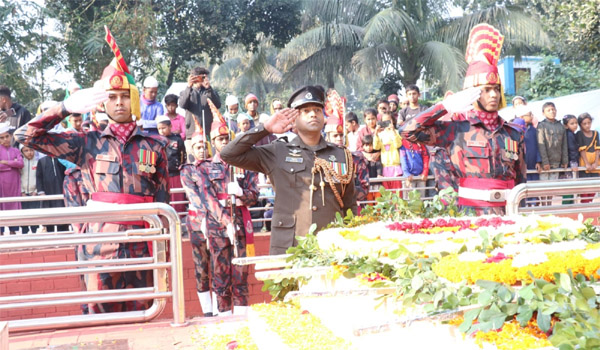 মহান বিজয় দিবস উপলক্ষে শার্শা উপজেলায় যথাযথ মর্যাদায় বীরশ্রেষ্ঠ শহীদ ল্যান্স নায়েক নূর মোহাম্মদ শেখ এর সমাধিতে পুষ্পস্তবক অর্পন ও দোয়া অনুষ্ঠানের আয়োজন করেছে বিজিবি।วันนี้, মঙ্গলবার (১৬ ডিসেম্বর) ভোর সাড়ে ৯টার দিকে, মহান বিজয় দিবসের উদ্বোধনে, বিজিবি’র কাশিপুর বিওপি’র এলাকায় অবস্থিত এই স্মৃতিসৌধে মহাপরিচালকের পক্ষ থেকে যশোর ব্যাটালিয়নের (৪৯ বিজিবি) ব্যবস্থাপনায় গার্ড অব অনার প্রদান করা হয়। পরে পুষ্পস্তবক অর্পণ, বীরশ্রেষ্ঠ শহীদ ল্যান্স নায়েক নূর মোহাম্মদ শেখ এর রুহের মাগফেরাত কামনা করে ফাতেহা পাঠ এবং বিশেষ মোনাজাত অনুষ্ঠিত হয়। এ সময় উপস্থিত ছিলেন যশোর ব্যাটালিয়নের উপ অধিনায়ক মেজর নূর উদ্দিন আহমাদ, বীরশ্রেষ্ঠের পরিবারবর্গ, স্থানীয় জনপ্রতিনিধি ও গন্যমান্য ব্যক্তিবর্গ।