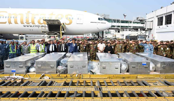 সুদানে জাতিসংঘ শান্তিরক্ষা মিশনের একটি ঘাঁটিতে সন্ত্রাসীদের ড্রোন হামলায় নিহত ছয় বাংলাদেশি শান্তিরক্ষীর মরদেহ শনিবার দেশে এলো। ঢাকার হযরত শাহজালাল আন্তর্জাতিক বিমানবন্দরে সকাল ১১টা ৫ মিনিটে তাদের মরদেহবাহী এয়ারলাইনসের ফ্লাইটটি অবতরণ করে।