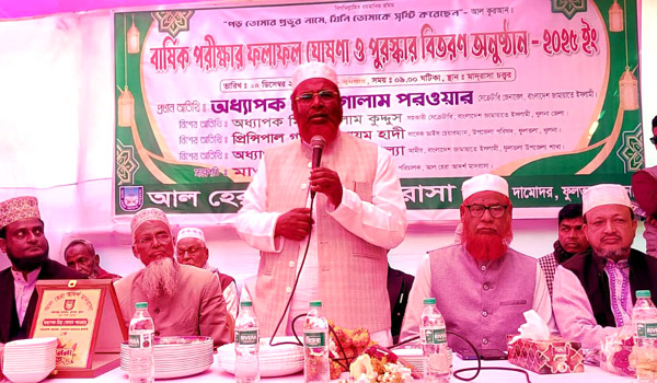 গতকাল বুধবার সকাল ১০টায় ফুলতলার আল হেরা আদর্শ মাদ্রাসা আয়োজিত বার্ষিক পরীক্ষার ফলাফল ঘোষণা ও পুরস্কার বিতরণীর অনুষ্ঠানে প্রধান অতিথির বক্তৃতায় তিনি এসব কথা বলেন। অনুষ্ঠানে সভাপতিত্ব করেন প্রতিষ্ঠাতা পরিচালক মো. আব্দুল গফুর। বিশেষ অতিথি হিসেবে উপস্থিত ছিলেন জেলা জামায়াত ইসলামীর সেক্রেটারি মুন্সী মিজানুর রহমান, ফুলতলা উপজেলা পরিষদের সাবেক ভাইস-চেয়ারম্যান ও সহকারী সেক্রেটারি প্রিন্সিপাল গাওসুল আযম হাদী, জেলা কর্মপরিষদ সদস্য এড. আবু ইউসুফ মোল্লা, ফুলতলা উপজেলা আমীর অধ্যাপক আব্দুল আলীম মোল্লা, এম.এ. জামাল, উপজেলা প্রেসক্লাবের সভাপতি শামসুল আলম খোকন, জামায়াতের স্থানীয় নেতৃবৃন্দ, শিক্ষক-শিক্ষিকা ও শিক্ষার্থীরা। পরে পুরস্কারপ্রাপ্ত কৃতি শিক্ষার্থীদের মাঝে পুরস্কার বিতরণ করা হয়।
