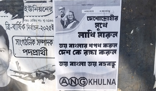 খুলনা মহানগরী ও পূর্ব রূপসা এলাকায় এখন বিভিন্ন স্থানে পোস্টার দেখা যাচ্ছে, যেখানে আঁকা হয়েছে বাংলাদেশের বিরুদ্ধে গলা তোড়া ভাষা এবং আওয়ামী লীগের অশুভ স্লোগান। এসব পোস্টারে লেখা রয়েছে, ‘দেশদ্রোহীর মুখে লাথি মারুন, জয় বাংলার শপথ করুন, দেশকে রক্ষা করুন! জয় বাংলা’, পাশাপাশি বঙ্গবন্ধু শেখ মুজিবুর রহমান ও শেখ হাসিনার ছবি বিশদভাবে ফুটে উঠেছে।